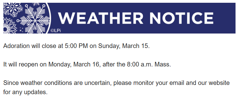 Adoration will be closed on Wednesday, March 18, from 10:00 to 11:00 a.m. It will also be closed on Saturday, March 21, from 10:00 a.m. to Noon.